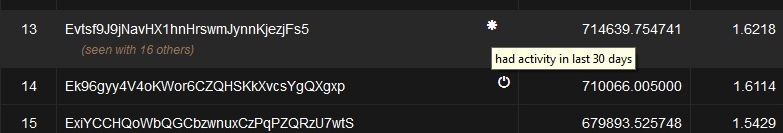 Addresses without symbols had their last activity in between those periods (more than 30 days but less than a year.)